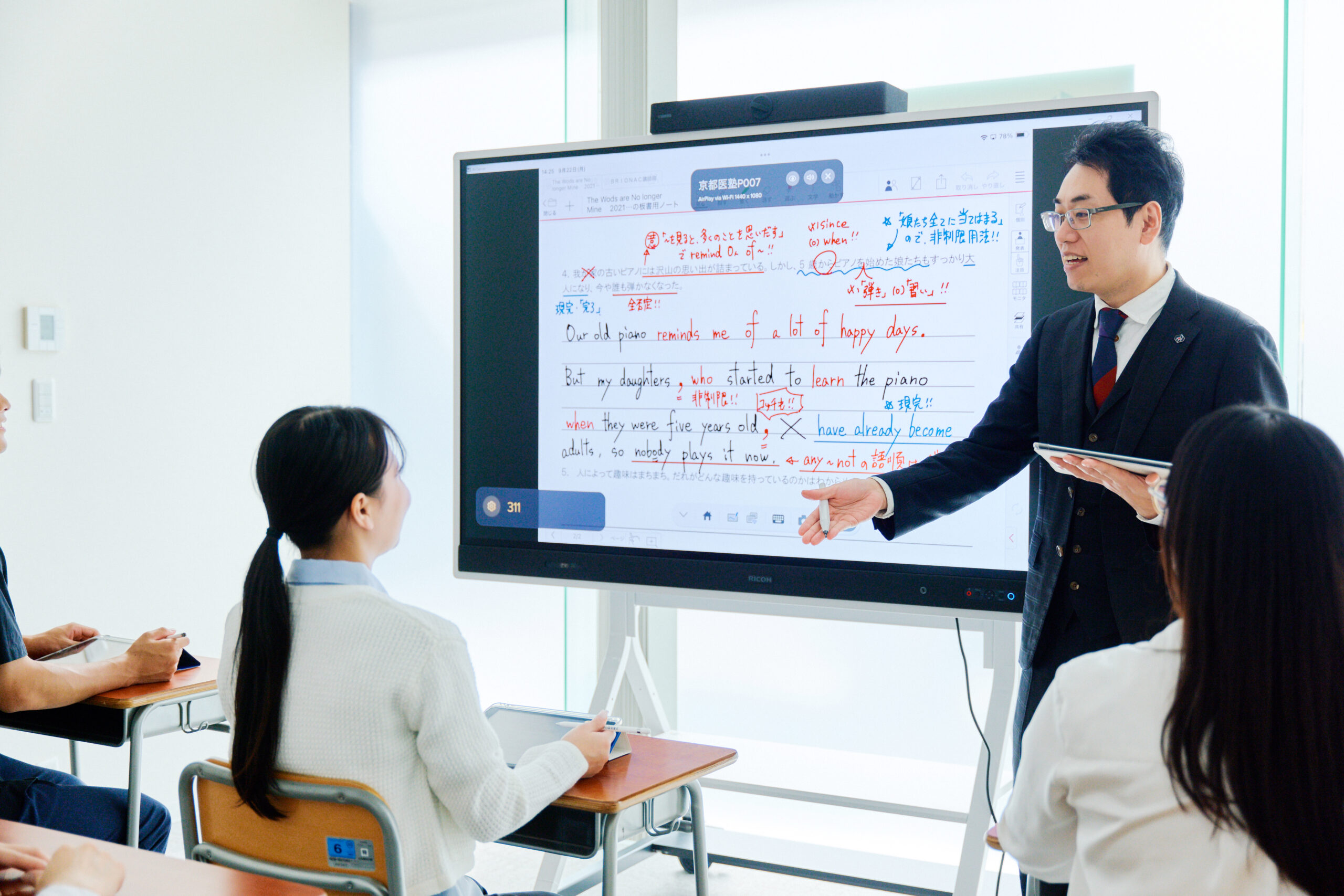 まずは対面の授業をICT化する必要があると考え、先駆けてiPadを導入していましたが、この度、電子黒板も導入しました。今後は、電子黒板を活用した集団授業を、全国の生徒さんに高いクオリティで届けていきたいと考えています。